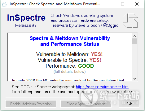软件能够一秒检测出你系统是否对Meltdown和Spectre免疫,如果是那就显示YES,不是那就显示NO,第三行显示就是你电脑的状态,GOOD就是代表良好。