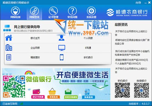 3、网银助手运行前请确保您的电脑已经链接互联网,并能正常访问顺德农商银行网站