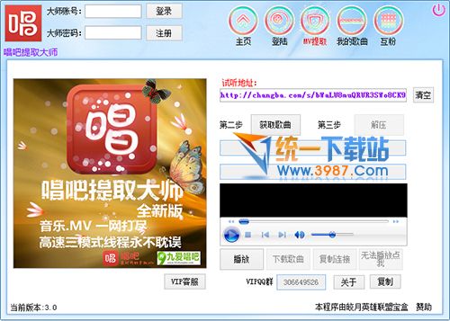 唱吧提取大师是一款专业的唱吧mp3提取工具,能够帮助你轻松下载你喜欢的唱吧歌手的歌曲。唱吧提取大师主要提取你的分享地址,分享地址获得方法为先点击你喜欢的唱吧歌手,在评论右边有分享按钮点击进入分享界面(有qq空间、新浪、人人网),然后选择你要分享的地方比如qq空间分享,分享成功以后就可以在qq空间看到你的分享地址,新浪、人人网分享都是一样的。只要复制地址到唱吧提取大师就可以快速、安全,一键解析、复制、下载。