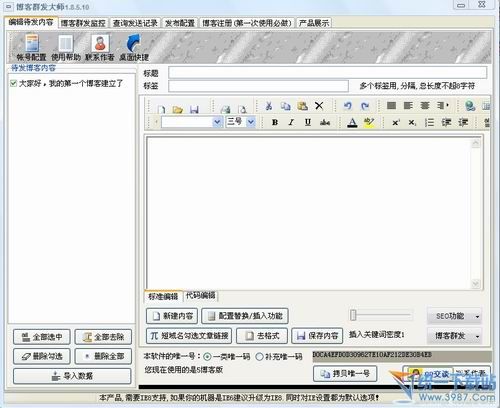 一款免费的专业的离线编辑博客,并能够一口气发送博文到多个博客的智能化系统。你只要填好内容,点击发送既可,编辑和发送过 程中都是所见即所得。用户可以随时点“停止”中断发送。并且可以实时查看网站的发布效果。本软件目前已经支持2000多个国内外高权重博客 。是博客写手不可多得的利器,也是网站推广者必备工具。