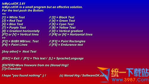 IsMyLcdOK是一个检测液晶显示器是否存在坏点的小程序。软件只有12KB大小,可以不需要安装直接运行,也不需要其它运行环境,按0-9执行检测,或者按任意键依次进行检测,F1回到菜单