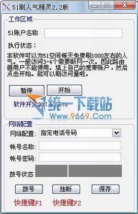 本软件可以为51空间每天免费刷1000左右的人气。一般访问3-4个需要断网一次。因此路由器用户不能使用。填上自己的宽带账户,然后点击开始。就可以刷访问量啦。