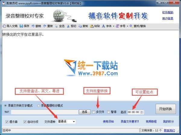 3、 文稿校对功能,可实现文稿自动跟随语音进度滚动、快速暂停标注错误,并自动加入时间文稿编辑、排版、保存。