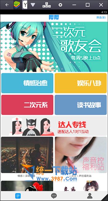 1、各大平台FM频道主播在嘤嘤开直播了,有逗比的娱乐达人,有情感催泪天使,有二次元的COSER萌妹,有让耳朵怀孕的配音,嘤嘤是个有内容、有感动、有精神的地盘。