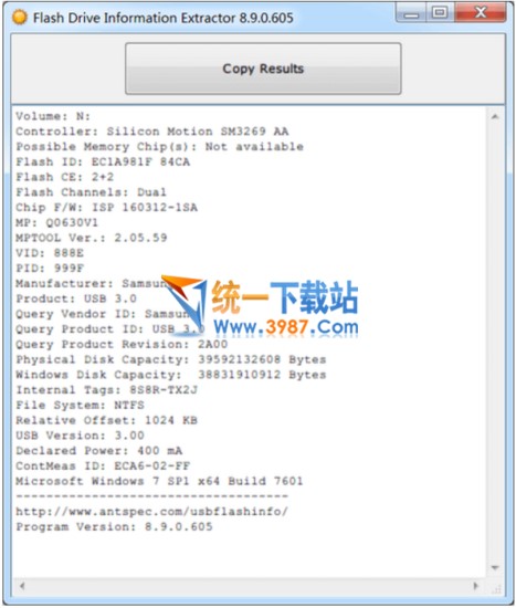 Flash Drive Information Extractor是一款体积小且功能强的U盘检测工具。此工具可以检测到主控类型和品牌,闪存类型和品牌,和vid pid,U盘名称,特别的是还可以测出固件的版本,输入usb电流大小等等,是英文版本,没有中文版。