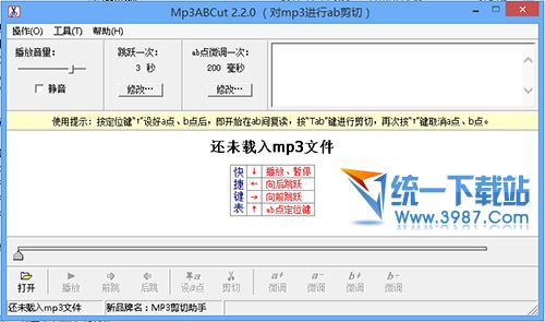 1. 边听边设置a、b剪切点,快捷键如下:* (↓)播放、暂 停。* (→)向前跳跃。* (←)向后跳跃。* (↑)剪切点(a/b)定位键。2. 音质保障:直接剪切mp3文件,没有音质损失。