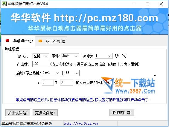 华华鼠标自动点击器一个很有用的免费小软件,如果你在平时的游戏或是工作中经常需要大量点击鼠标左键或右键,如果你喜欢玩网络游戏,rpg游戏,那么一定有大量点击鼠标的经验,非常浪费时间,浪费精力,消耗鼠标!这个小软件可以解放你的手指啦!只要按下热键,让鼠标自动点击器帮你点击吧!鼠标点击速度可以调节,鼠标左键右键也可以选择。新版本可以自定义热键