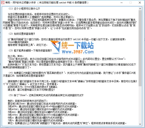 7、或n:通过向设定窗口模拟发送n键的方式关闭烦窗。其它:如果通过以上代码仍有“顽固窗口”不能关闭,请将关闭代码置为“其它”,程序将尝试非常规手段关闭烦窗。