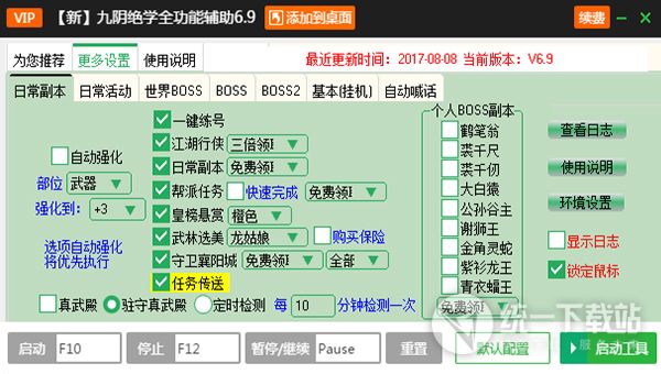 2、一键日常副本:自动强化、一键练号、江湖行侠、日常副本、帮派任务、皇榜悬赏、武林选美、守卫襄阳城、任务传送、真武殿;