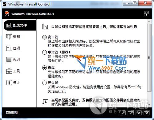 3.低过滤:允许与规则不匹配的出站连接。只有那些符合阻止规则的程序是阻止出站和入站。