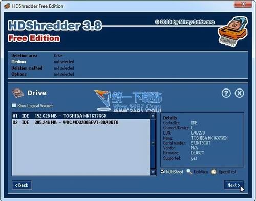 开始选择驱动器 - 如果你想同时删除两个或多个驱动器,选择“Multishred”,然后选择“删除磁盘上的数据”(deleting data from the disk )的方法 - 通过您选择,更彻底的数据粉碎过程,虽然会慢得多。 “选项”屏幕可以单独留在家中,除非您是高级用户,然后点击下一步开始跟着一丝一毫的驱动器中的问题。一旦完成,你可以处置,如你所愿。