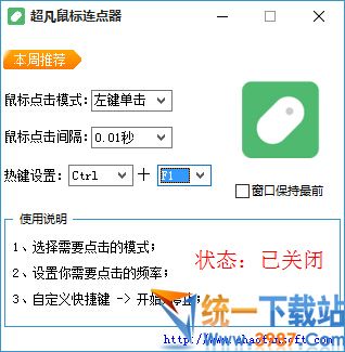 超凡鼠标连点器是一款简单小巧的鼠标连点工具,能够自定义左键单击、右键单击、双击等操作类型,还能自定义点击间隔和快捷键,软件简单易用,是玩挂机类游戏的最佳助手。