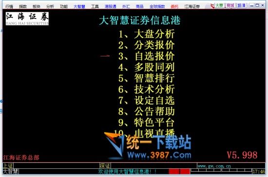 江海证券大智慧是集行情、分析、交易、资讯于一体的证券信息平台,具有行情揭示、技术指标、丰富的信息资讯、深入的技术分析,还为高水平投资者设计了自编公式、系统评价等功能,委托交易支持开放式基金交易、基金盘后业务、多银行存管业务、股份报价转让业务和安全认证功能。