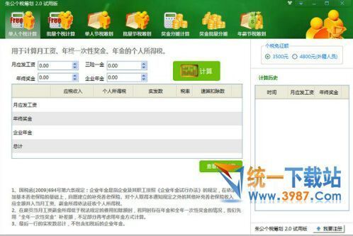 2.单人节税计算:适用于规避一次性奖金的“盲点”,使月工资和全年一次性奖金年的税负最小化,或者在个人所得不受影响情况下,计算单位最少支出的发放方式;