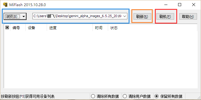 点击橙色圈选部分刷新,刷机程序会自动识别手机,刷机模式选择“清除所有数据”,点击红色圈选部分刷机开始刷机。