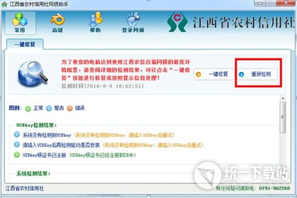 提示:首次运行网银助手,请插上USBKEY并点击“重新检测”,网银助手会自动检测出当前使用USBKEY所有软、硬件的必备环境。
