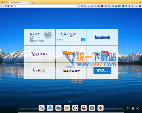 1.Lightning Newtab 预设有八个网页可以选择,包含一个天气预报,还有网页搜寻功能,点选下方的设定钮可自行变换,把自己常用的网页加入首页画面。