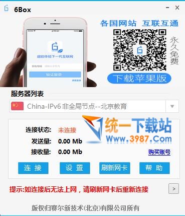 6Box是畅游下一代互联网的实用工具,软件可以使用户无需升级现有网络,直接使用6Box产品就可以访问谷歌学术Scholar,IPv6高清电视、高校IPv6网站等优质资源,有需要的朋友欢迎下载使用。