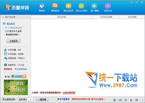 流量神器是一款免费安全的淘宝刷流量软件,服务于刷淘宝店铺流量、刷qq空间人气、刷博客流量、刷网站ip流量、刷alexa排名,是提升网站流量的必备神器,欢迎大家使用流量神器。